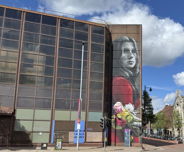 In contrast to the mural, the surrounding building appears quite run-down, with boarded-up windows and faded panels, making the artwork stand out even more as a moment of colour and life in an otherwise bleak urban setting. The juxtaposition seems intentional, breathing life into an overlooked part of the cityscape.